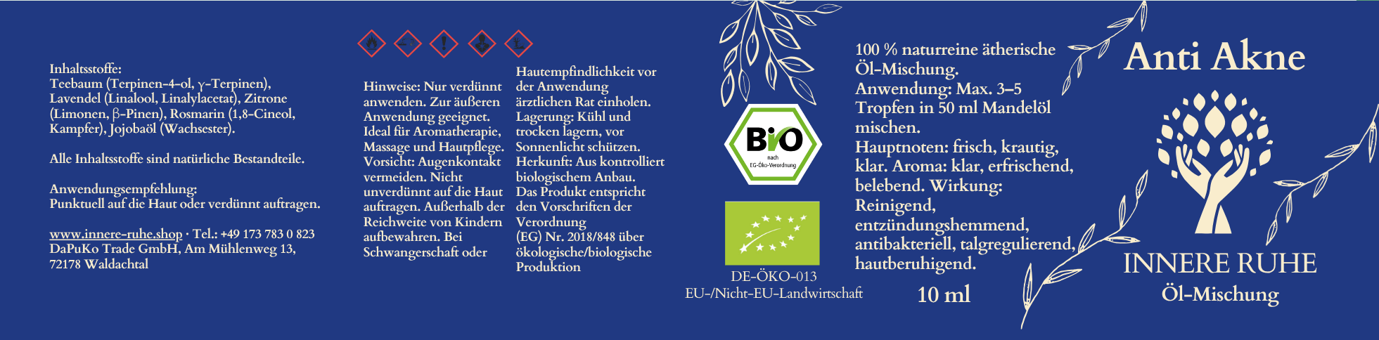 Unsere ätherische Ölmischung Anti-Akne ist BIO-zertifiziert und 100% naturrein. Sie wird nach strengen Qualitätsstandards hergestellt und regelmäßig geprüft, um sicherzustellen, dass du ein sicheres und effektives Produkt erhältst. Mit ihrer Hilfe kannst du deine Haut sanft und natürlich unterstützen.