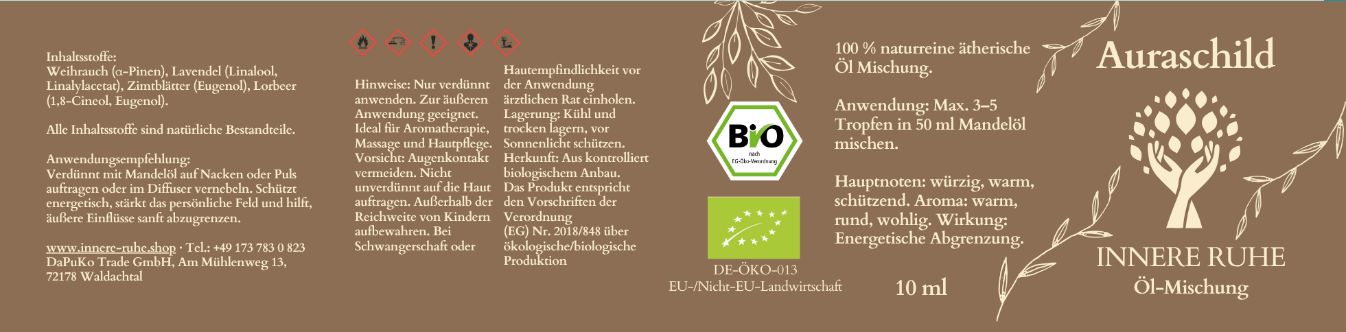 Unsere Ätherische Ölmischung Auraschild ist BIO-zertifiziert und besteht aus 100% naturreinen, qualitativ geprüften ätherischen Ölen. Die hochwertigen Inhaltsstoffe werden durch ein schonendes Herstellungsverfahren gewonnen, das die Reinheit und Wirksamkeit der Öle bewahrt.