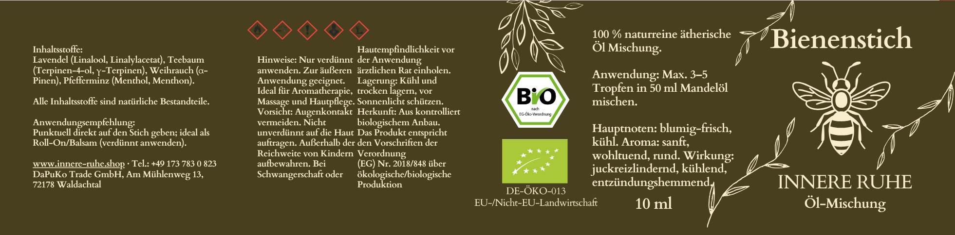 Die ätherische Ölmischung Bienenstich-Balsam – Harmonischer Duft, 100% naturrein von Innere Ruhe wird mit der höchsten Achtsamkeit und Verantwortung hergestellt. Sie ist 100 % naturrein und BIO-zertifiziert, was die Verwendung nur der reinsten und hochwertigsten Inhaltsstoffe versichert. Jede Charge wird regelmäßig auf Reinheit geprüft, um sicherzustellen, dass Sie stets die beste Qualität erhalten. Wir empfehlen den Bienenstich-Balsam punktuell und verdünnt anzuwenden. Führen Sie vor der ersten Anwendung einen Patch-Test durch, um sicherzustellen, dass Sie nicht allergisch auf die Inhaltsstoffe reagieren. Die sachgerechte Lagerung des Öls ist auch wichtig. Bewahren Sie es kühl, trocken und lichtgeschützt auf, um seine Qualität und Wirksamkeit zu erhalten.