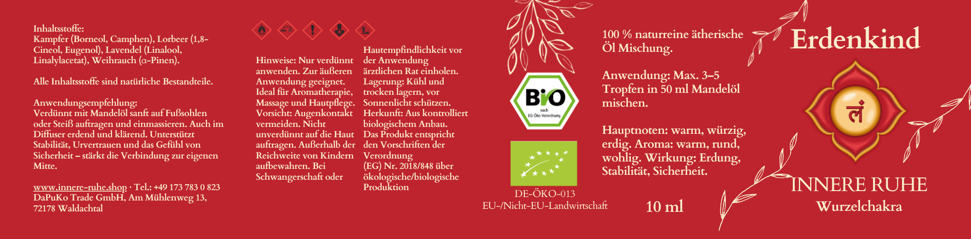 - Auf emotionaler Ebene unterstützt die ätherische Ölmischung Erdenkind unser Wurzelchakra, das Zentrum für Stabilität und innere Stärke.