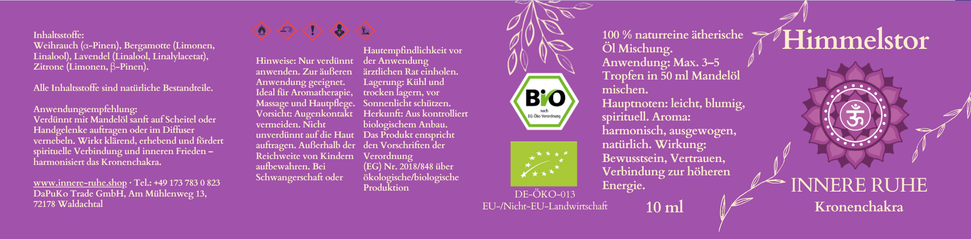 Die ätherische Ölmischung Himmelstor – Kronenchakra – Harmonischer Duft, 100% naturrein | Innere Ruhe ist mehr als nur ein ätherisches Öl. Es ist eine Einladung, sich selbst etwas Gutes zu tun, den Moment bewusst zu genießen und eine tiefere spirituelle Verbindung zu finden. Es ist ein Naturöl, das mit höchster Sorgfalt und Verantwortung hergestellt wird. Es ist ein Teil unserer Mission, Ihnen natürliche, hochwertige und nachhaltige Produkte für Ihr Wohlbefinden anzubieten. Probieren Sie es aus und erleben Sie, wie es Ihr Leben bereichert.