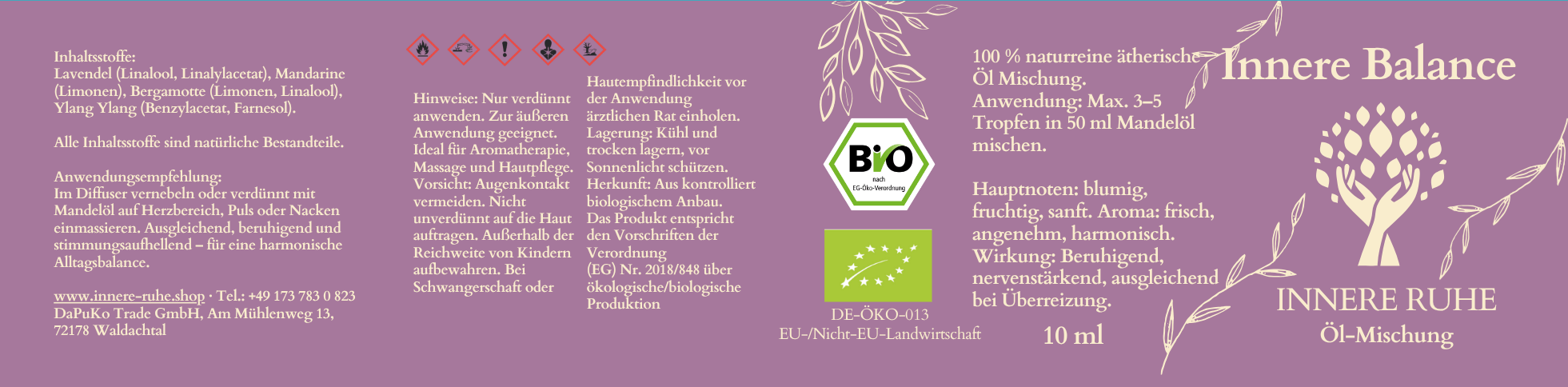 Unsere Mischung „Innere Balance“ ist ein BIO-zertifiziertes, 100% naturreines ätherisches Öl, das speziell entwickelt wurde, um Ihnen bei der Suche nach Entspannung zu helfen. Die sorgfältig ausgewählten Inhaltsstoffe – Lavendel, Mandarine, Bergamotte, Ylang Ylang – tragen dazu bei, ein Gefühl der inneren Ruhe und Ausgeglichenheit zu fördern. Ihr Duftprofil ist sanft, blumig und fruchtig und hinterlässt einen angenehm beruhigenden und nervenstärkenden Duft, der bei Überreizung ausgleichend wirken kann.