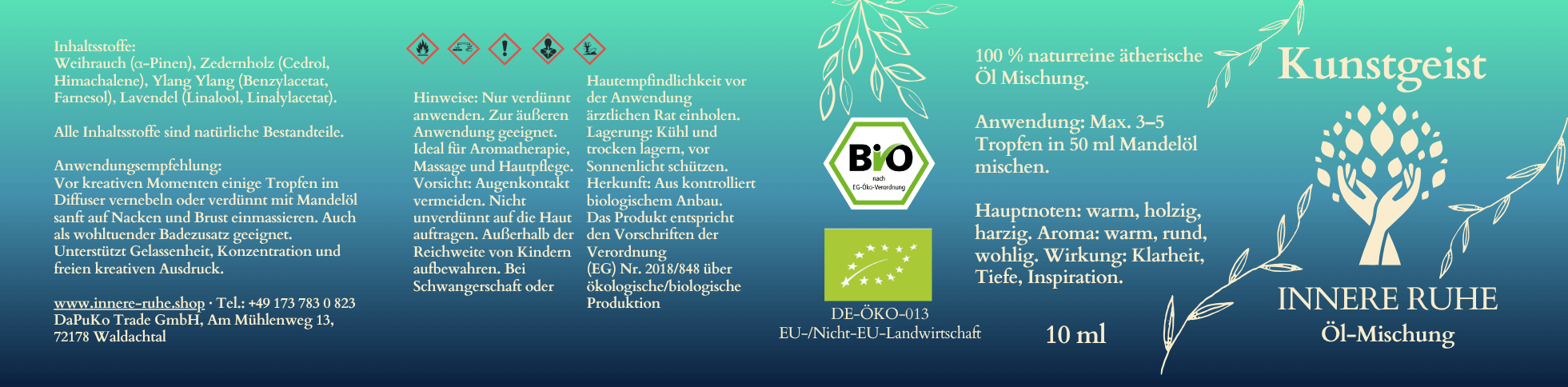 Unsere ätherische Ölmischung Kunstgeist ist BIO-zertifiziert, 100% naturrein und wird aus hochwertigen Inhaltsstoffen hergestellt. Jede Charge wird sorgfältig geprüft, um eine gleichbleibend hohe Qualität zu gewährleisten. Die Mischung ist frei von synthetischen Zusätzen und Konservierungsstoffen und wird in einem schonenden Verfahren gewonnen, um die natürlichen Eigenschaften der ätherischen Öle zu bewahren. Damit garantieren wir Ihnen ein Produkt, das höchsten Ansprüchen genügt.