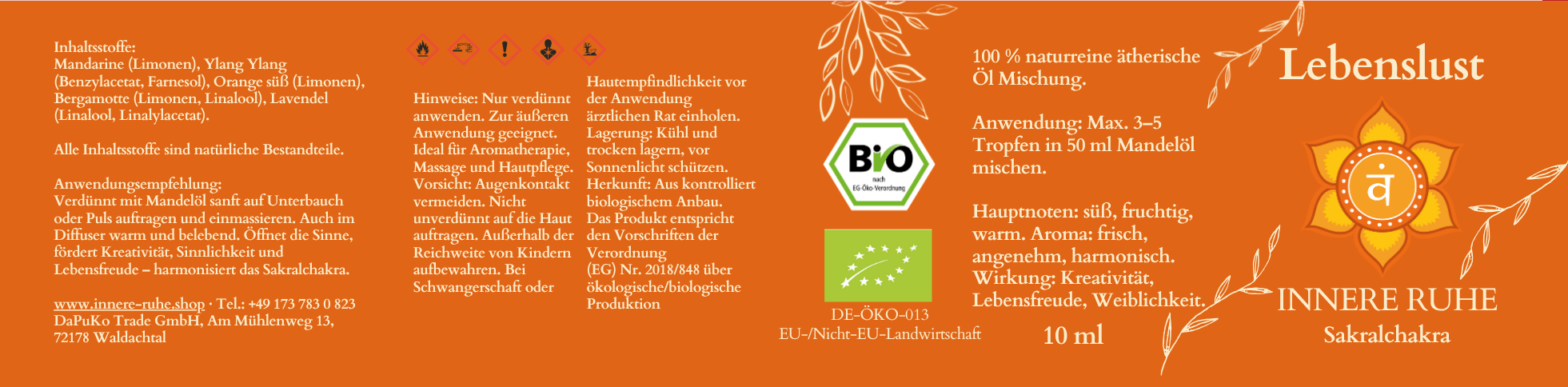 Die ätherische Ölmischung Lebenslust – Sakralchakra – Harmonischer Duft, 100% naturrein | Innere Ruhe ist mehr als nur ein ätherisches Öl. Sie ist ein Versprechen an Sie selbst, sich Zeit für Ihr Wohlbefinden zu nehmen und den Moment bewusst zu genießen. Hochwertig, natürlich und nachhaltig – für Ihre Balance und Harmonie im Alltag. Entdecken Sie die Welt der Düfte neu und lassen Sie sich von der Qualität und Verantwortung unserer Marke Innere Ruhe überzeugen. Denn Ihr Wohlbefinden ist unsere Mission.