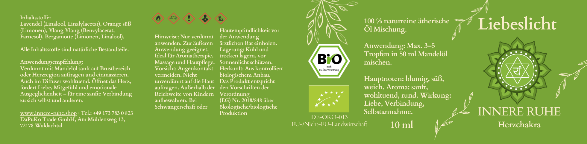Wir legen großen Wert auf die Qualität unserer Produkte. Unsere ätherische Ölmischung „Liebeslicht – Herzchakra“ ist BIO-zertifiziert und besteht aus 100% naturreinen, hochwertigen ätherischen Ölen. Sie wurde sorgfältig geprüft und schonend gewonnen. So können Sie sich auf ein Produkt verlassen, das höchsten Qualitätsstandards entspricht und mit Liebe und Sorgfalt hergestellt wurde.