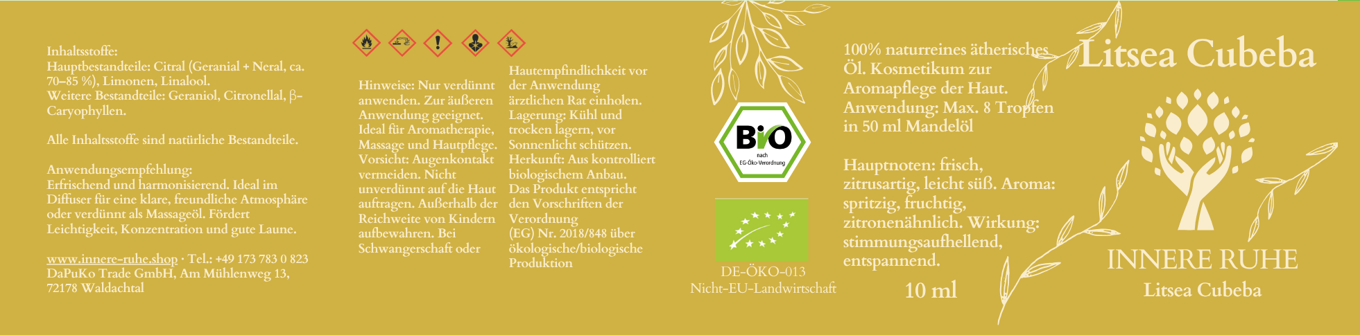 Ätherisches Litsea Cubeba Öl – Bio-Qualität, 100% naturrein | Innere Ruhe ist mehr als nur ein Dufterlebnis. Es ist eine Einladung, sich selbst etwas Gutes zu tun, die innere Balance zu stärken und den Moment bewusst zu genießen. Ob im Diffuser oder als Bestandteil Ihrer Hautpflege – unser Litsea Cubebaöl begleitet Sie mit seinem einzigartigen Duftprofil durch den Tag. Es ist ein Produkt, das in Bio-Qualität hergestellt wird, und das sich durch seine hohe Reinheit und Qualität auszeichnet. Gönnen Sie sich dieses besondere Wohlfühlerlebnis und entdecken Sie die positiven Eigenschaften des ätherischen Litsea Cubebaöls für Ihr Wohlbefinden.