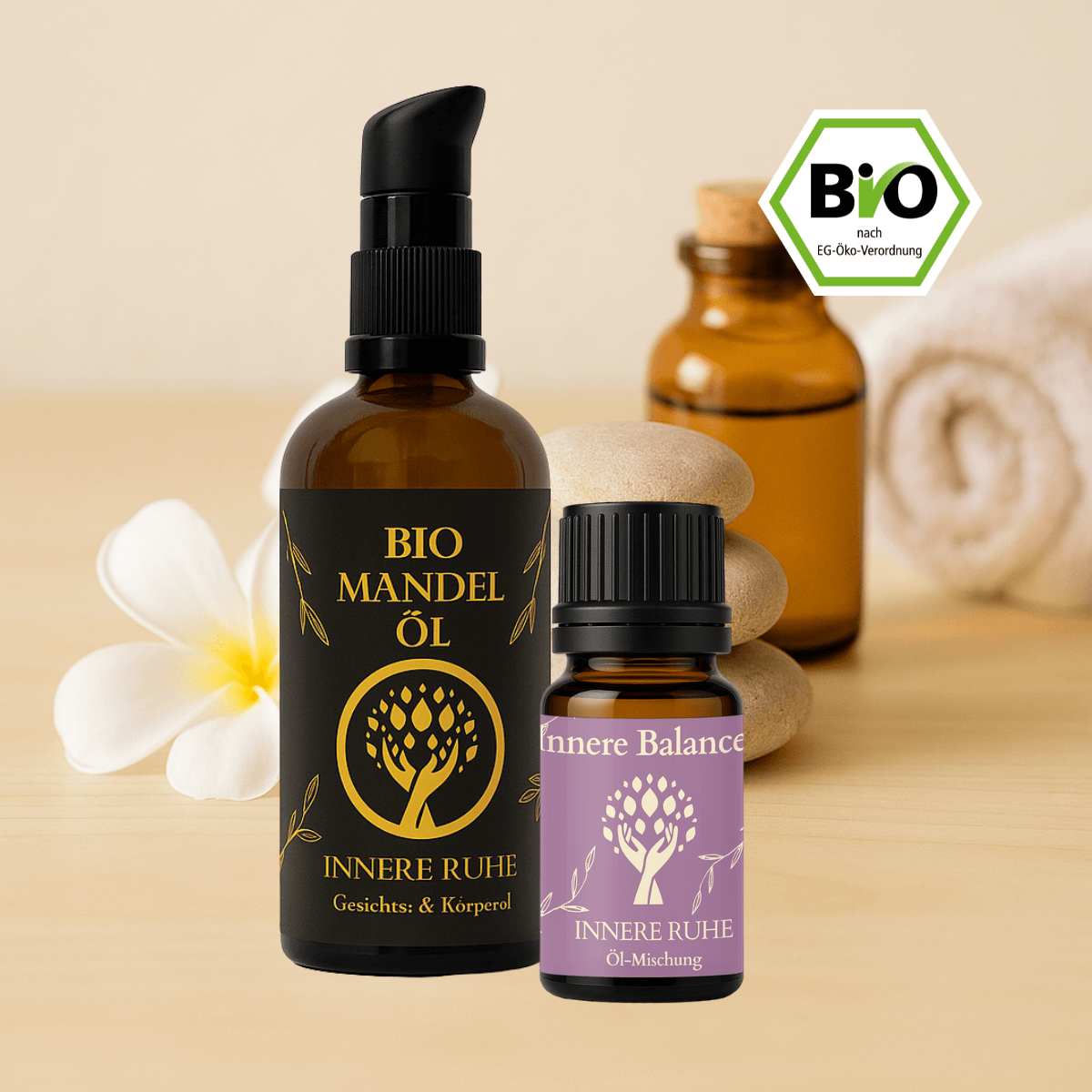 Das Öl-Set „Sanfte Entspannung“ besteht aus einer kuratierten Auswahl von 100% naturreinen Ölen, einschließlich Mandelöl, das bekannt für seine pflegende Wirkung ist. Das Duftprofil ist zart, warm und entspannend mit sanfter Tiefe. Die genaue Zusammensetzung unseres Sets ist auf der Produktverpackung und auf unserer Website angegeben.