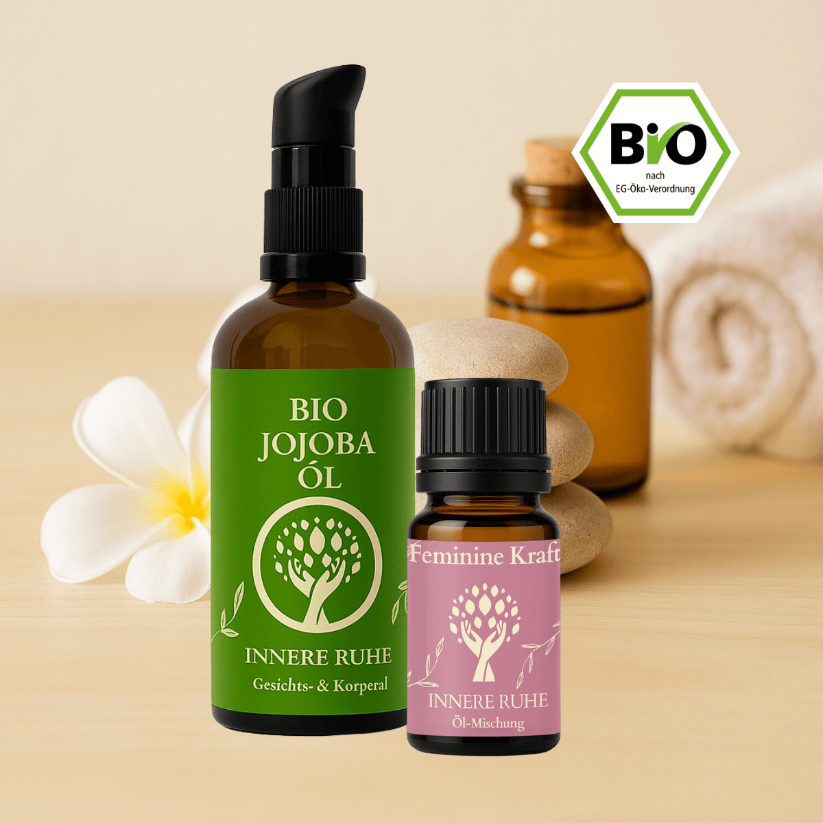 - Jojobaöl 100 ml – sanft und beruhigend, unterstützt die Hautgesundheit und fördert die Entspannung.