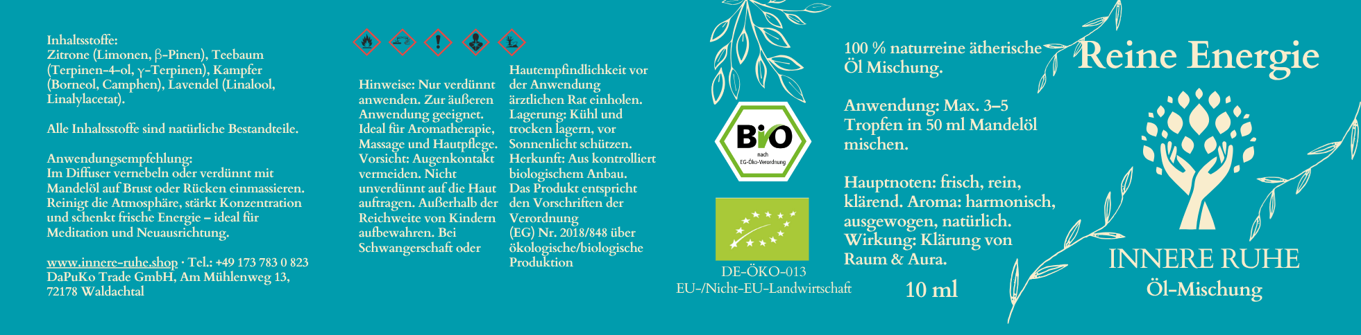 Unsere Ätherische Ölmischung Reine Energie – Harmonischer Duft, 100% naturrein | Innere Ruhe ist mehr als ein Duft – es ist ein Versprechen an Sie. Ein Versprechen für hohe Qualität, Reinheit und Nachhaltigkeit. Ein Versprechen für Ihr Wohlbefinden. Tun Sie sich selbst etwas Gutes, atmen Sie tief ein und genießen Sie den Moment mit der reinigenden Kraft unseres ätherischen Öls.