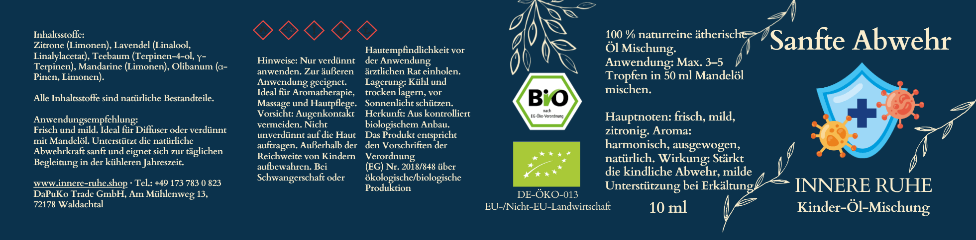 Ätherische Ölmischung Sanfte Abwehr – Harmonischer Duft, 100% naturrein | Innere Ruhe ist mehr als ein ätherisches Öl – es ist eine Einladung, sich selbst etwas Gutes zu tun und den Moment bewusst zu genießen. Mit seiner sanften Stärkung des Immunsystems, seiner frischen, zitronigen Note und seiner BIO-zertifizierten Qualität ist es eine natürliche Hilfe bei Erkältung Kindern. Unsere Mission ist es, hochwertige, natürliche und nachhaltige Produkte für Ihr Wohlbefinden zu schaffen. Entscheiden Sie sich für Innere Ruhe und erleben Sie den Unterschied.