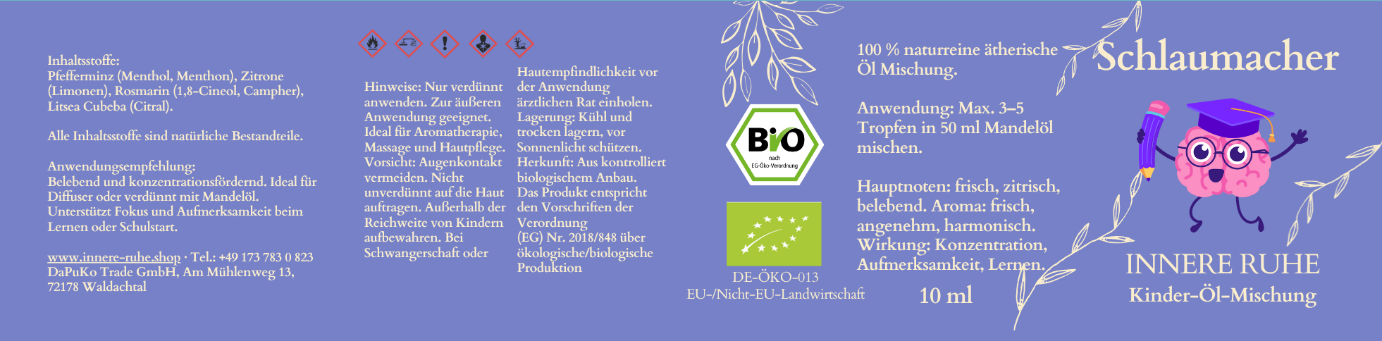 Unsere Mischung „Schlaumacher“ wurde speziell entwickelt, um Kindern beim Lernen zu helfen. Sie enthält eine harmonische Kombination von 100% naturreinen ätherischen Ölen wie Pfefferminz, Zitrone, Rosmarin und Litsea Cubeba. Diese sind bekannt für ihre belebenden Eigenschaften, welche die Aufmerksamkeit und Energie fördern können. Bitte beachten Sie, dass die Wirkung individuell unterschiedlich ist und keine medizinische Wirkung garantiert werden kann.