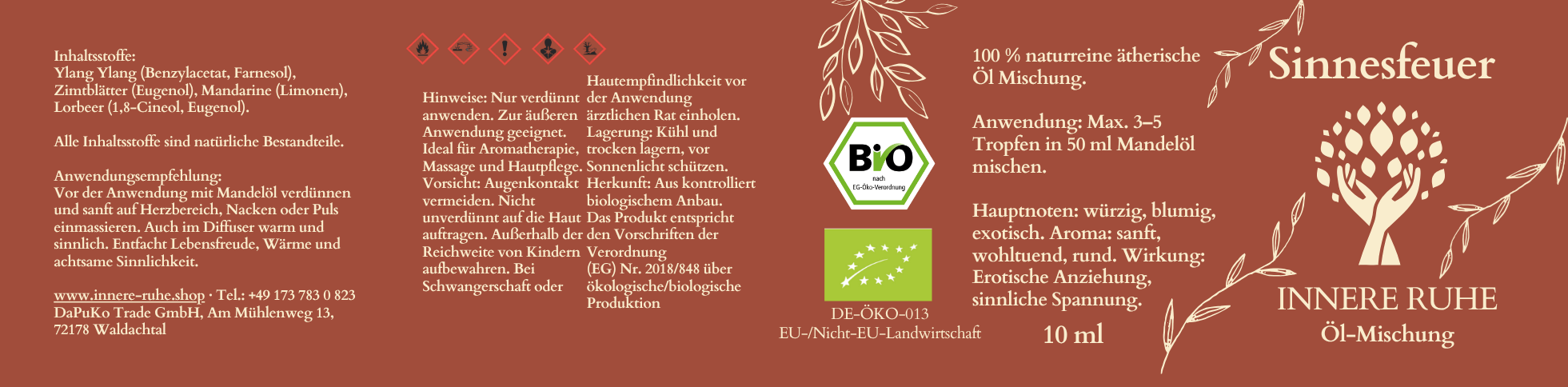 Unsere ätherische Ölmischung Sinnesfeuer besteht aus 100% naturreinen, hochwertigen Ölen: Ylang Ylang, Zimtblätter, Mandarine und Lorbeer. Diese Kombination sorgt für einen exotischen, würzigen und zugleich blumigen Duft, der sinnliche Spannung und erotische Anziehung entfacht.