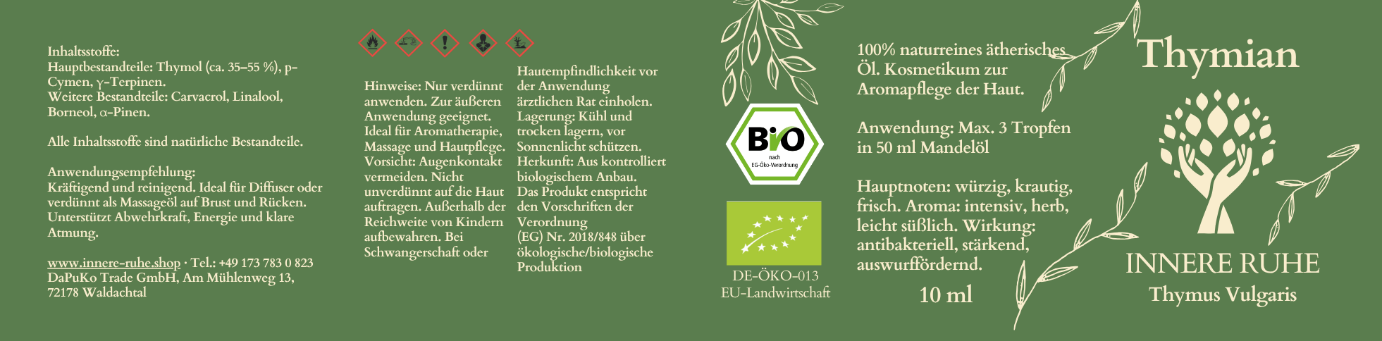 Das Ätherische Thymianöl – Bio-Qualität, 100% naturrein | Innere Ruhe ist die perfekte Wahl für alle, die eine natürliche, antibakterielle und stärkende Alternative für ihre tägliche Pflege und ihr Wohlbefinden suchen.