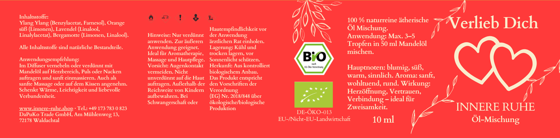 Die ätherische Ölmischung Verlieb Dich – Harmonischer Duft von unserer Marke Innere Ruhe vereint höchste Qualität und Verantwortung. Wir setzen auf 100% naturreine ätherische Öle, die mit Sorgfalt ausgewählt und schonend gewonnen werden. Unser BIO-zertifiziertes Produkt wird regelmäßig auf Reinheit und Qualität geprüft. Bitte beachten Sie, dass es stets verdünnt angewendet werden sollte und ein Patch-Test vor der ersten Anwendung empfohlen wird. Für die richtige Lagerung sorgen Sie am besten, indem Sie das Öl kühl, trocken und lichtgeschützt aufbewahren.