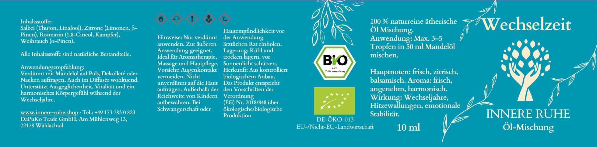 Unsere ätherische Ölmischung Wechselzeit ist BIO-zertifiziert und 100% naturrein. Sie besteht aus ausgewählten, hochwertigen ätherischen Ölen, die schonend gewonnen wurden, um ihre wertvollen Eigenschaften zu erhalten. Jedes Produkt von uns durchläuft strenge Qualitätskontrollen, um sicherzustellen, dass es unseren hohen Standards entspricht.