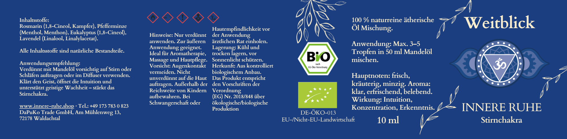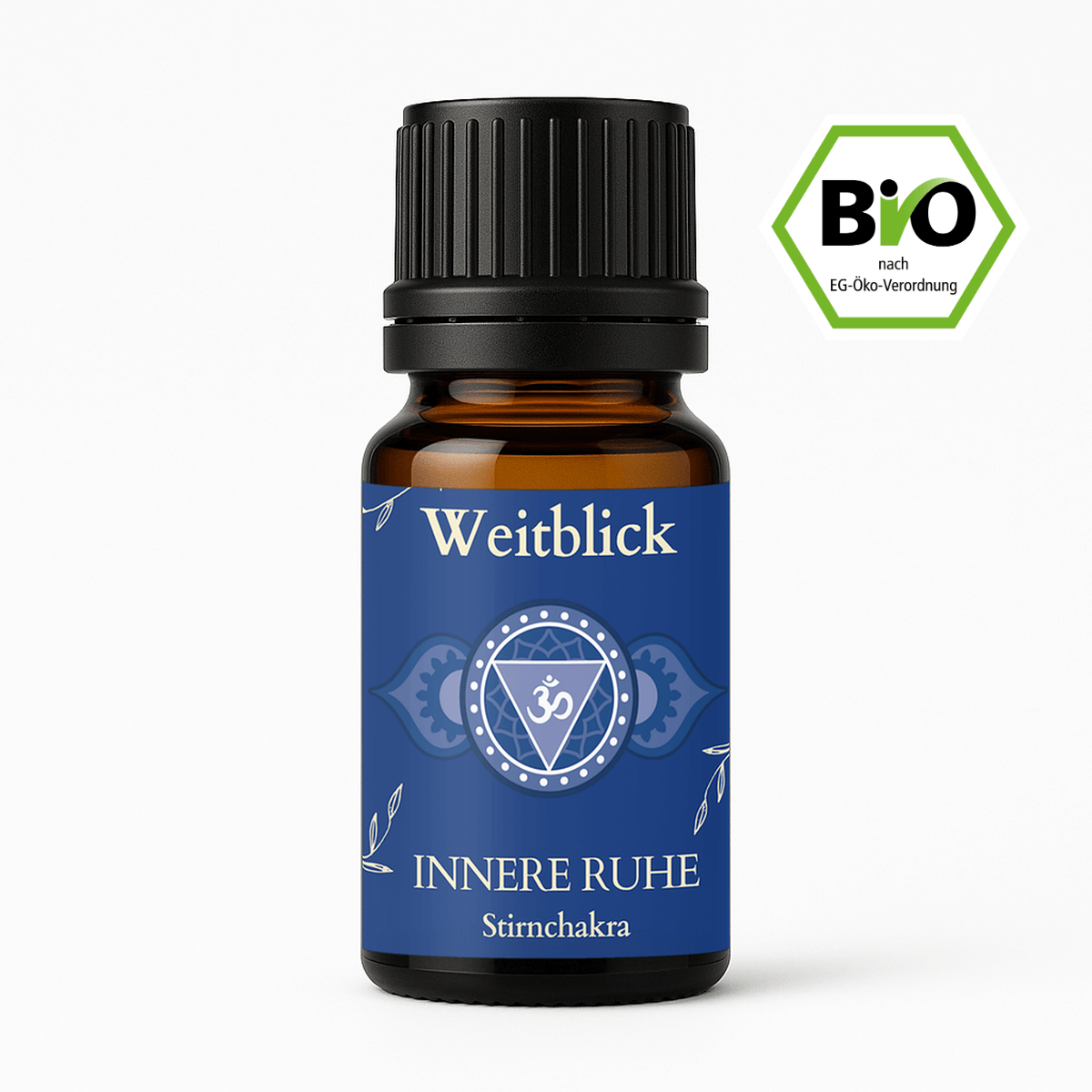 Unsere ätherische Ölmischung Weitblick – Stirnchakra – Harmonischer Duft, 100% naturrein | Innere Ruhe steht für Qualität, die man riechen kann. Sie wird mit größter Sorgfalt und hochwertigen, naturreinen Zutaten hergestellt. Das Ergebnis ist ein BIO-zertifiziertes Produkt, das regelmäßig auf seine Reinheit geprüft wird. Denken Sie daran, das Öl stets verdünnt zu verwenden und vorab einen Patch-Test durchzuführen. Zur optimalen Haltbarkeit sollte es kühl, trocken und lichtgeschützt gelagert werden.